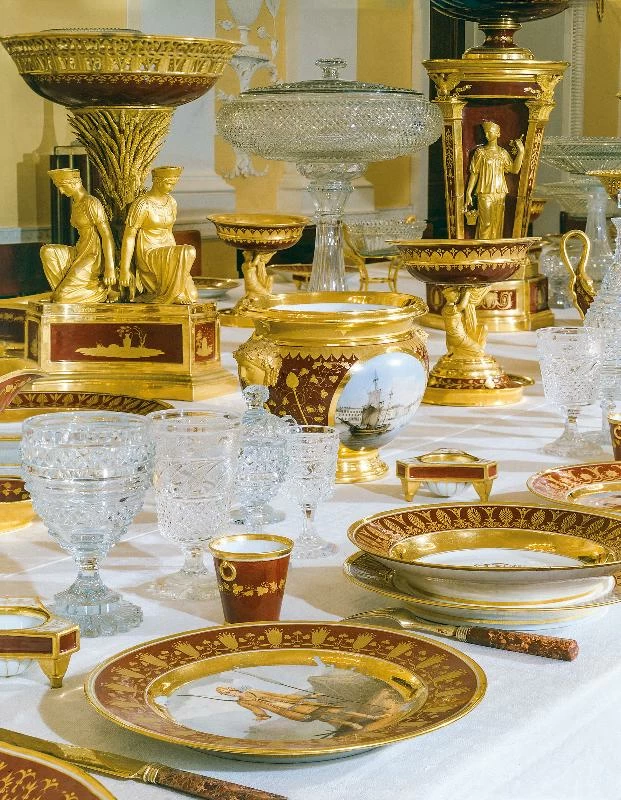 Во времена Александра I императорский фарфор уже не столь часто отражал великие деяния императора. В фокусе художников все чаще оказываются национальные темы, всплеск интереса к которым стал особенно заметен после Отечественной войны 1812 года. Сервиз «Гурьевский», создаваемый в 1809–1816 годах, стал фарфоровой одой народу-победителю. Его основная часть экспонируется сегодня в Екатерининском корпусе ГМЗ «Петергоф» и по праву считается выдающимся произведением Императорского завода.