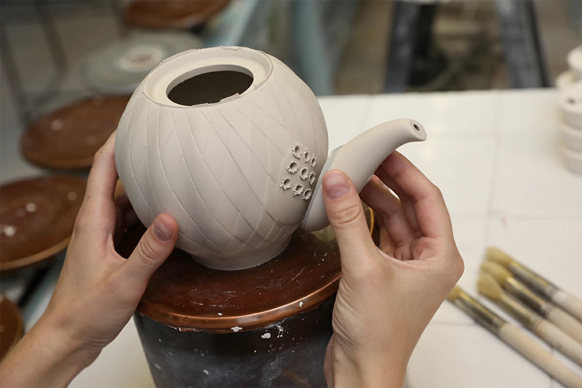 Фарфоровое изделие подвергается обжигу несколько раз. Температура обжига некоторых изделий достигает 1430°С, при этом изделие может провести в печи несколько суток. Политый глазурью обожженный черепок передают на декорирование.